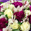 Step into summer with our Radiant Bouquet, a stunning combination of white roses, alstroemeria, and bold purple carnations. This unique arrangement showcases the vibrant colors and natural beauty of each flower.