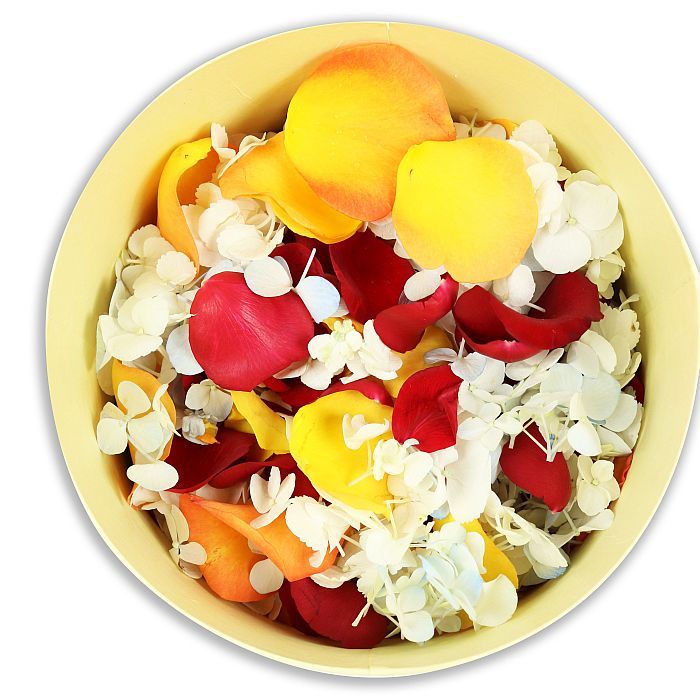 Immerse yourself in the splendour of our handcrafted flower arrangement. This masterpiece features a delightful medley of hand-selected Hydrangea, Rose, and Chrysanthemum petals, known for their impeccable freshness and vibrant hues. Each flower is carefully chosen to guarantee a breathtaking presentation that enhances any decor.
