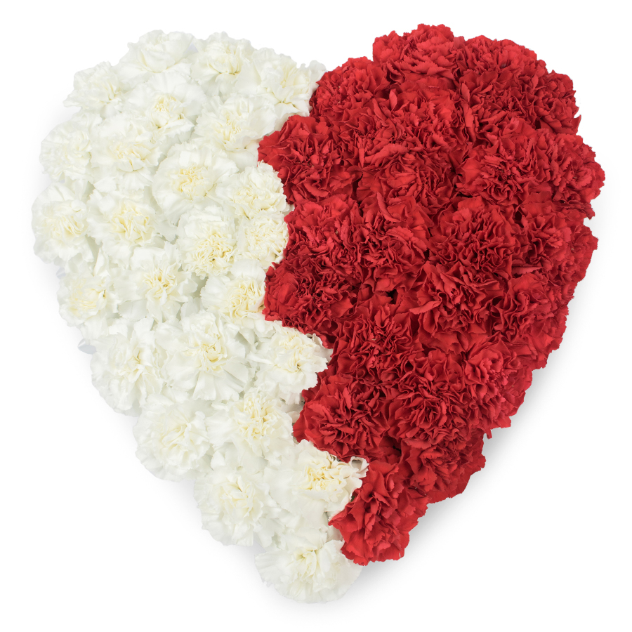 Celebrate love and sympathy with our stunning heart-shaped bouquet of white and red carnations. Every bloom is hand-picked to ensure exceptional freshness and vibrant colors.